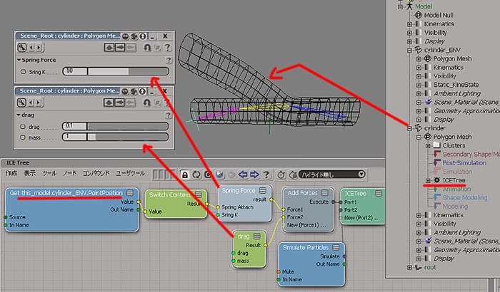 だとさ。つまり、バネ定数Kと伸縮する距離xを設定することでバネらしい動きを再現できる、ということでした。 では、まずは簡単なバネっぽい動きをするパーティクルの作成から始まります。 ![]() パーティクルのタスク内 Emitters > Emit from Surfaceを取り出して、 GetGridでグリッドを発生場所(Emitter1)として接続します。 Emit from Surface内の項目では、 レートの種類を[パーティクルの総数] にし、パーティクルの発生数を [10] 個とし、速度を限りなく [0] に近い数値(0.3)を設定しています。 0にするとシーン再生時に全く動かなくなりますので、その方が良い場合もあります。Shape は見やすく為にSpereにしています。 Getters > Get Partivle Emit Locationで発生したパーティクルの位置を取得し、そのPositionをSpringForceに接続します. SpringForceのノードでバネ定数Kとしての値を10としています。 このSpringForceコンパウンドの中身は、下図のようになっています。(発生地点と現在の位置を割った距離にK値を掛けた位置) 簡単なものですが、たくさん使いそうでしたらコンパウンド化して登録しておくと便利です。 >> Spring Force.xsicompound ![]() Drag Forceはつまり減衰値になります。ここを0に設定するとずーーーと上下にバウンドしたままになります。 最後はツール > Simulation > SimulateParticlesを一番下の最後のPortに接続します。これが無いとパーティクルが生まれません。 これで設定が完了していますので、シーンをプレイバック状態にして(ループモードにすると良いです)、Gridを動かしてみると、10個のパーティクルがぼよよーんと追従して来ます。 Spring K とStrenth の値を変更することで色々な動きに変化します。 バネらしい動きとは、つまりこの”減衰度合いをうまくコンロトールすること”になります。 そこで、この減衰する部分のノードを更に追求したのが次の例です。 Spring Forceの利用2 さー、ぐーんとノードが増えて来ましたが、前半は同じです。 改良されているのは、減衰部分のSpringDamperForceノード以下です。 最初の例で利用しているデフォルトで存在するDrag Forceの中身を見ると、実は結構複雑なのです。 ここでのSpringDamperForceというコンパウンドの中身はたったこれだけです。 ![]() パーティクル・タスク内の Getters>GetParticleVelocity でも同じです。パーティクルの速度の取得だと解ります。 次は少し長いですね。 GetDataで Self.EmitLocationで放出ロケーションを取得して、 ツール内> DataAccess> GetDataAtPreviousFrameを取り出してpointpositionを取得しています。 これは前フレームでの位置、下は現在の位置を取得して 2つの入力値の差(減算値)にツール内 > DataAccess > SimulationStep 数を掛けています。その値がVelBに来ています。 シミュレーションのステップとは1フレームの長さを秒単位で出力したもので、 フレーム数と秒数を変換する場合、またはフレーム単位で表された属性と秒単位で表された属性を変換するとヘルプに書いてあります。 Spring kd には 1 が入っています。 つまり全体では秒単位距離を速度で割った値に定数を掛けたということらしい。 結果、このSpringkdの値を小さくすると、バネの振動が収まる時間が長くなるという風に制御されました。(減衰値なので、値が大きいとはやくおさまると・・) Springkd の値を0.5にしてGridを動かすと、かなりプルンプルン♪な動きになります。楽しい!! Spring Force の応用例;アホ毛 日本文化(?)らしく、このSpring Forceから作成されたバネの動きをキャラクターのアホ毛に適応する例を紹介します。 アホ毛とは、キャラクターの頭から数本ピョンと突出た毛のこと、 英語ではFrizzって書いてあるが本当に通じるのか?どっちかって言うとそれは縮れっ毛?英語に出来ないからこそ日本文化なり。 以下に記述している点を知っておくと、ノードを接続できなかった時に「はた!!」と気付く事多いです。 それはパーティクルの位置データをポリゴンやNull等オブジェクトのグローバル値に直接つなげようとした時に起こります。 パーティクルのPointPositionはマルチポイントのデータ(1個しか放出していなくても)なので直付けできないのです。 白枠の部分がその設定です。 では詳しく見てみましょう。 あ、パーティクルの総発生数は1個になっています。 まずは”頭”を想定したSphereの子供にボーン構造を作成し、 同じく発生源であるGridを小さくしてSphereの子供にし、レンダリングされないようにVisibilityを変更し、ボーンのエフェクターの位置に設定しました。 Gridのセンターは”頭”を想定したSphereの位置にあります。 ![]() ![]() 発生したパーティクルは、たとえ1つだったとしでもそのPointPositionは複数の値用のデータになっています。 発生させた最初のパーティクルのID値は0だと解っています。 つまり、ここの設定は、己の見てID=0のパーティクルのLocationを取得して、パーティクル1個の値をGetします。 [値の表示]をすると、ちゃんとID=0のパーティクルのグローバル値が表示されます。 あとは簡単ですね。その値をエフェクターのグロー