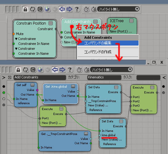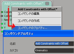 すると、あたらしく X・Y・Z軸の入力が出来ています。 AddConstraints の名前の所に*が付いています。これは内容を編集していていることを示しています。 ![]() どうせなら、あたらしいノードとして保存しておきましょう。右マウスボタン > コンパウンドのプロパティーを選択し、名前を変更します。