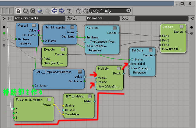 見るところは、そのグローバルの値が入力されている所に、追加の値も入るようにすれば良い、ということです. その方法は、実はもうやっているのです。Scalarto_3DVector を接続した記述なんです。 Math> Multiply と Conversion > SRTtoMatrixと Conversion > SRTtoMatrix を探し出し、順につなぎ合わせます。 コンパウンドは箱と考えて、左の●からデータが入力され、右の●で結果を出力しています。 では、左の●に今作った X・Y・Z軸の値が入るように接続部を作ってあげます。 左上の●から引っ張って来た白い矢印を X、Y、Z とつないであげます。 ![]()