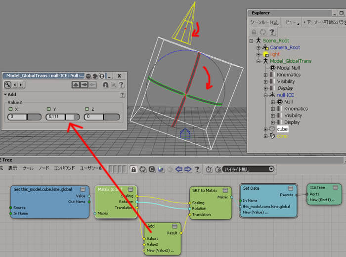 ICE Tree の表示、シーン内の任意のオブジェクトに設定まずは ICE Tree のオブジェクトへの設定からです。 > > そんなん知ってるよ!! という方はどんどん吹っ飛ばして行ってください。 プリミティブの立方体を取り出し、ALT+9 キーで表示されたICETree設定画面で 作成 > ICEツリーを実行するとICETree というノード が出現します!!以上です。すべてはここから始まります・・・。 ![]() シーン内の大きな構造体、例えば人体構造体などを制御するようなICEを作ったとしても、 シーン内の特定のオブジェクト、例えばセンターに置いてある Null に ICETree をくっ付けておけば良いようです。 ただし、そのシーンを受け取った側からすると、どこに ICEが設定したのか解らないので、 名前を付けた特徴的なオブジェクトに設定するなど、何かルールを作っておいた方が良いように思います。 (たとえば、正四面体に付けるとか・・・、ICEというカーブに付けるとか・・、中心にあるNullに付けてあるよとか・・) さて、話を戻して、この立方体を動かしてみましょう。(いきなりちょっと進むよ。こんなん作るからついて来て・・・!!) この左の SRTtoMatrix というノードをダブルクリックするとPPGが表示され↓、そこに値を入れると立方体がその値に変化するというものです。 作り方は・・・ ![]() 1)SetData 値を設定するノードです。[ set ]までを検索する空欄に記入すると、Set で始まる名前のノードにしぼって表示します。 その中から、 SetData を探し出し、ドラッグ&ドロップして画面上に持ってきます。 真赤っかになっています。これはデータが正しく設定されてない時の表示です。 SetData ノードをダブルクリックするとPPGが表示されるので、[ Explorer ] ボタンを押して、Cubeの GlobalTransform のノードをクリックします。 ![]() この青くなった SetData の出力を ICETreeノードのPort1に接続しやがれーです。 ![]() 検索から文字を無くしたことを確認して、Conversion > SRTtoMatrix を探し出し、 D&Dしてその出力を SetData の同じ色の入力に接続します。はい出来上がりです。 ![]() 「この SRTtoMatrix ノードに入って来る値をシーンの何かから得られればこの立方体をSRT変化させられる」 というもっとも基本的なキネマティクスが手に入れられたということです。 3)Scalar to 3D Vector Conversion > Scalar to 3D Vector を探し出し、その黄色の出力を SRT to Matrix の Translation に接続すると、 これで X,Y,Z軸への値を入力すると、その値で立方体が動くのか確認できます。 ![]() 何か数値を設定したい場合は、Constant 項目内のScalarや、例えば Pi なんてのがあります。