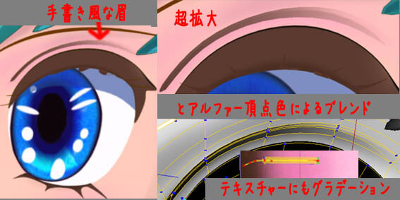 | 輪郭線/境界線の太さ調整、無しの場合 Toon_Ink_Lens のサンプリングタブ内の境界では、境界・マテリアル・オブジェクトは全て有効にしておきます。 あとはマテリアル; Toon_Paint_and_Host の方で境界のオーバーライト設定で、更に細かい設定をします。 輪郭線/境界線の太さ調整 オブジェクトの外側の輪郭線は太く、中の境界線はそれよりも細いとかは、Toon_Ink_Lensと Toon_Paint_and_Host のスプレッド値の違いで出します。 ![]() 異なるポリゴンオブジェクト間には線を描かないとか、同じオブジェクト内でも輪郭線を出さないとかを設定します。 目は人が強く意識して見るところですが、以下のように上記内容をしています。 異なるオブジェクト間でも輪郭線を出したくない場合は、 顔(=体)のマテリアルの継ぎ目タブで一緒として扱うオブジェト(この場合;両目)を登録します。 目の影部分は胴体の一部(クラスター)ですが、ポリゴンの輪郭であり輪郭線が出てしうところを、インクのオーバーライトを設定せず、 透明度タブで透明度を有効にしています。 ![]() 手書き風な表現;眉 早くも問い合わせを頂いたのが、眉の手書き風な表現はどうやっているのか、でした。 これも、前頁で紹介している、テキスチャーとアルファー頂点色とのブレンドになっています。 テキスチャー自身にも、混合する時に使う肌色(実際の肌色はツーン色との混合)と眉の茶色とのグラデーションで描いてあります。 ![]() |