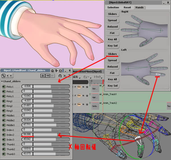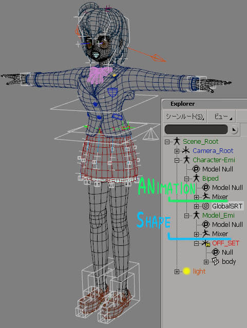 プロローグ 人体モデルを動かす リグ を作成し、エンベロープも設定出来、アニメーションを付け始める順番とします。 ここではアニメーションを付けるにあたって、幾つかの設定・機能を紹介していきます。 また、先にも書いている通り、機能毎にModelを2つに分けていて、 1つ目がBipedモデルでリグが入っています。 2つ目がModel_Emiモデルでポリゴンオブジェクトが入っています。 ![]() 1つ目のBipedモデルのMixerにはアニメーションが入っています。(アニメーション・トラック) 2つ目がModel_EmiモデルのMixerにはシェープアニメーションが入っています。(シェープ・トラック) ![]() |