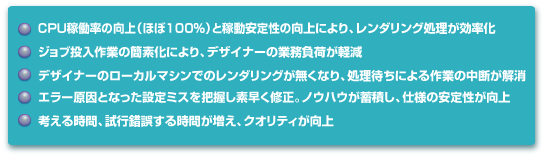 さらに、ジョブ投入ソフトの安定性が低かったために、レンダリングのミスや稼働停止が度々発生。以上のような理由から、レンダリングサーバーを使わずにローカルマシンでレンダリングを実行するデザイナーが後を絶たなかった。