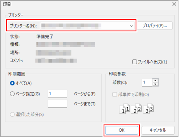 [プリンター名]で、プリンタまたはPDF変換ソフトを選択します。