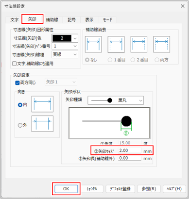 寸法線の矢印(黒丸)の大きさや種類を変更する