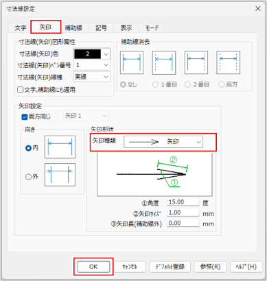 [矢印]タブをクリックして、[矢印種類]を変更し、[OK]ボタンをクリックします。