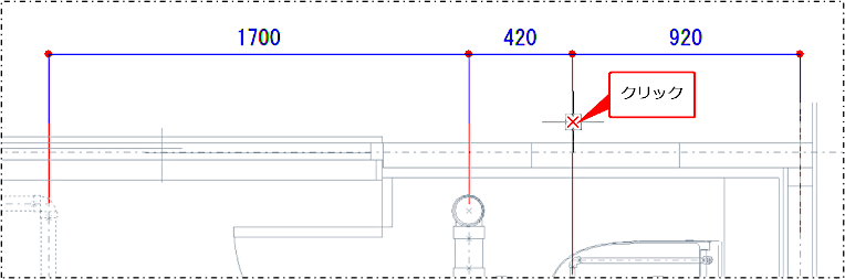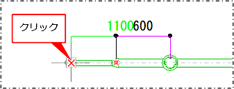 表示を変更する寸法補助線に近い寸法線の位置、または変更する方の寸法補助線をクリックします。