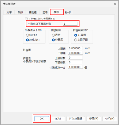 寸法値の表示形式を設定し、[OK]ボタンをクリックします。