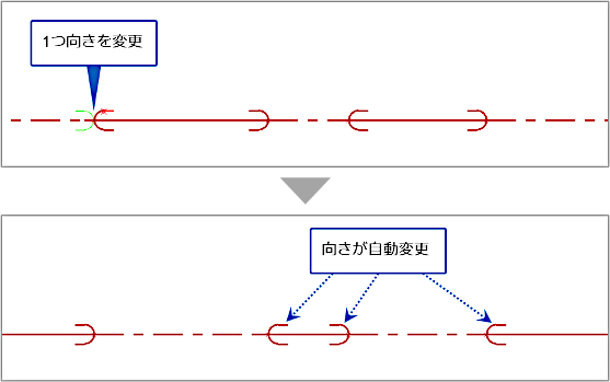 エンド伏せ記号の向きを変更した場合は、同一配線上の他のエンド伏せ記号の向きも変更されます。