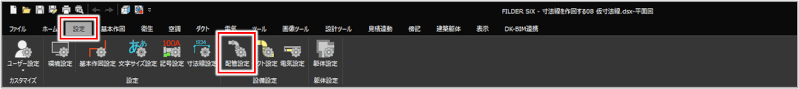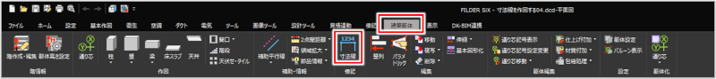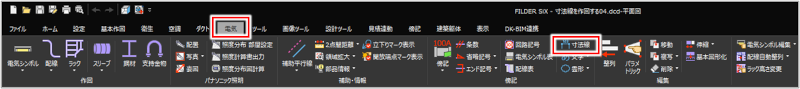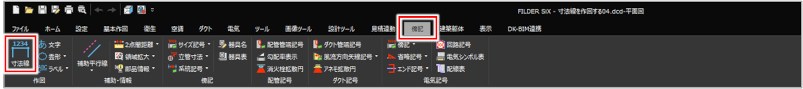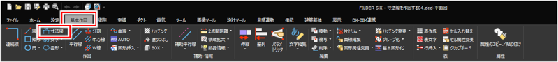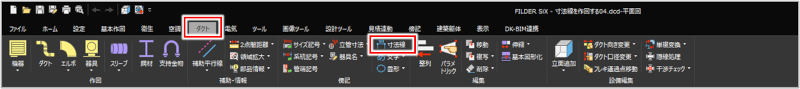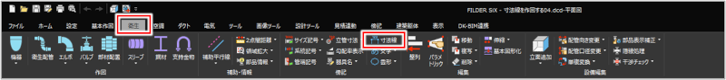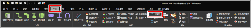 [基本作図]タブ>[寸法線] [衛生]タブ>[寸法線] [空調]タブ>[寸法線] [ダクト]タブ>[寸法線] [電気]タブ>[寸法線] [傍記]タブ>[寸法線] [建築躯体]タブ>[寸法線] |