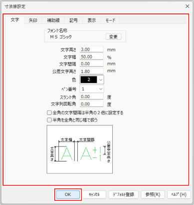 寸法線の設定を変更する場合はクリックします。 [寸法線設定]ダイアログで寸法線の内容を設定し、[OK]ボタンをクリックします。