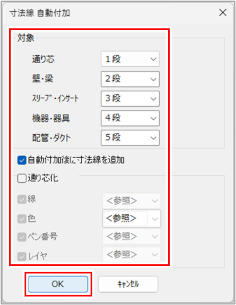 [寸法線 自動付加]ダイアログについて、詳しくは以下を参照してください。 |