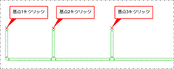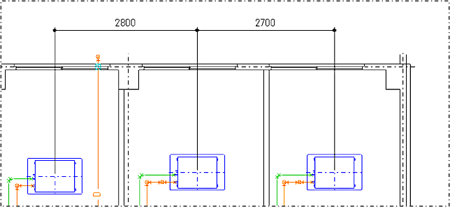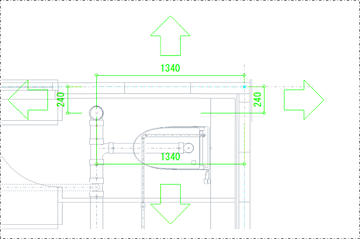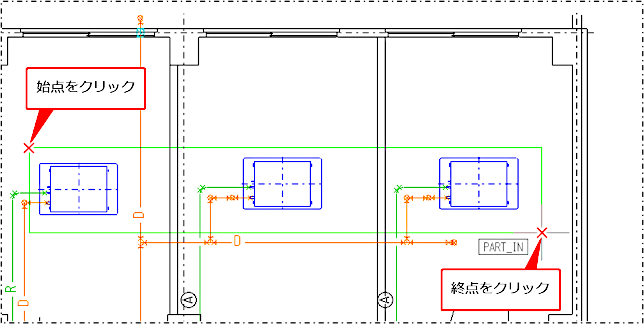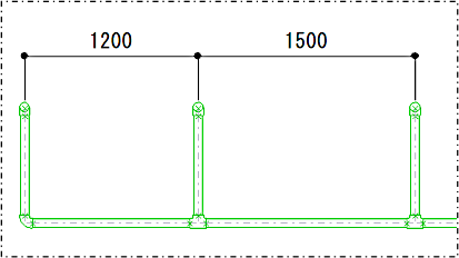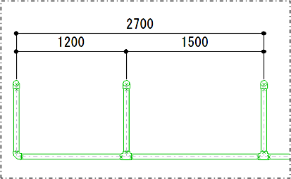 また、作図された配管・ダクト・機器などの部材を選択すると、近くにある基準線(通り芯・一点鎖線)から仮寸法線が表示されます。