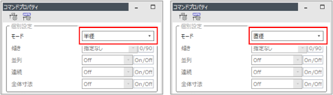 [コマンドプロパティ]の[モード]で[半径]または[直径]を選択します。