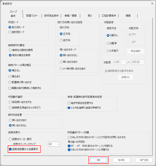 [基本]タブの[仮原点距離の寸法線表示]にチェックを付け、[OK]ボタンをクリックします。