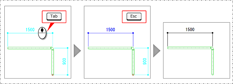 [Tab]キーで選択した仮寸法線の色が変わります。