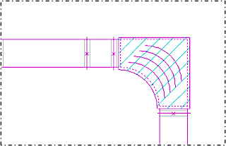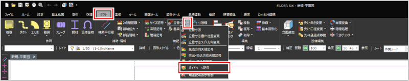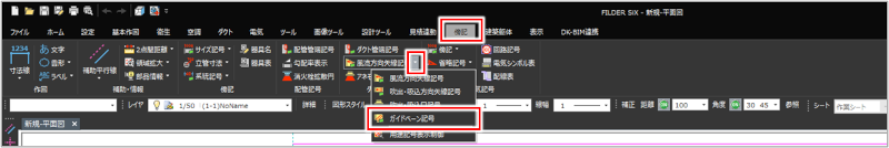 [ダクト]タブ>[立管寸法]プルダウンメニュー>[ガイドベーン記号] [傍記]タブ>[風流方向矢線記号]プルダウンメニュー>[ガイドベーン記号] |