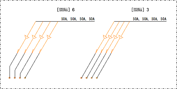 矢印の線同士の間隔を入力します。 例:間隔に「6」と「3」を入力した場合