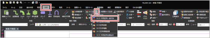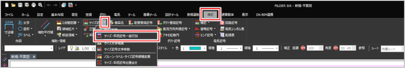 [衛生]タブ>[サイズ記号]プルダウンメニュー>[サイズ・系統記号一括付加] [空調]タブ>[サイズ記号]プルダウンメニュー>[サイズ・系統記号一括付加] [ダクト]タブ>[サイズ記号]プルダウンメニュー>[サイズ・系統記号一括付加] [傍記]タブ>[サイズ記号]プルダウンメニュー>[サイズ・系統記号一括付加] |