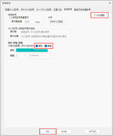 系統記号を配管と同じ色で配置する場合は、[設定]タブの[記号設定]コマンドをクリックして実行し、[記号設定]ダイアログの[系統記号]タブで設定します。