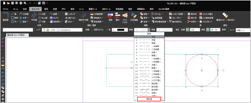共通項目ツールバーの[図形スタイル]の[線種]で[補助線]をクリックします。