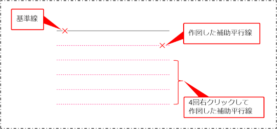 1本目の補助平行線を作図した後、線のないところで右クリックまたは[Enter]キーを押すと、補助平行線が等間隔で追加されます。