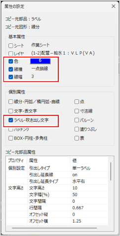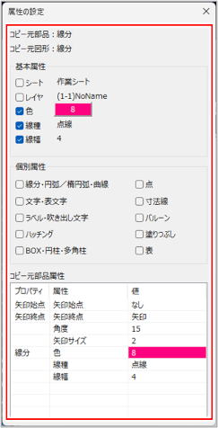 コピーする基本属性([シート][レイヤ][色][線種][線幅])にチェックを付けます。 |