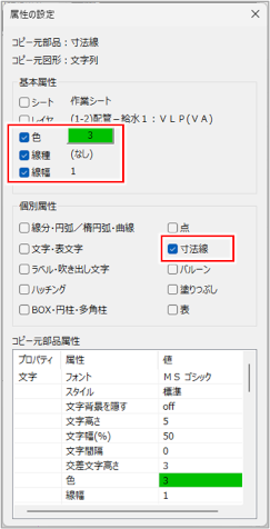 コピー元の寸法線と文字の属性が、コピー先の寸法線と文字に貼り付けられ、以下の属性に変更されます。