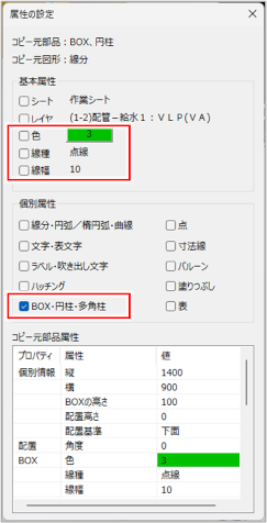 コピー元のBOXの個別属性が、コピー先のBOXに貼り付けられ、以下の属性に変更されます。