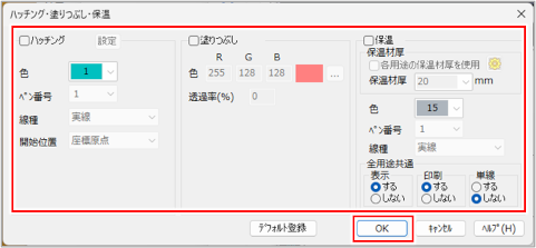 ハッチング・塗りつぶし・保温の設定を行い、[OK]ボタンをクリックします。