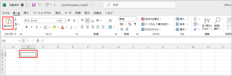 画像データを貼り付ける左上のセルをクリックし、[ホーム]タブの[貼り付け]をクリックします。