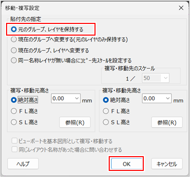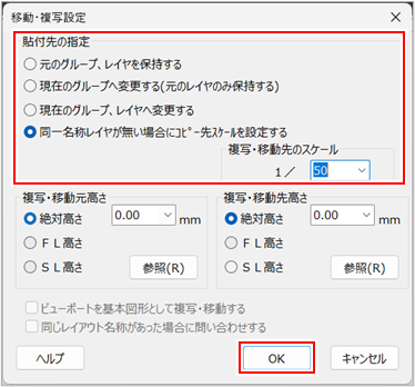 複写先図面での図形のグループ・レイヤ・作図スケールを設定し、[OK]ボタンをクリックします。