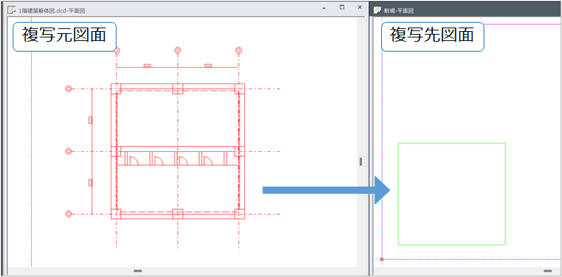 ファイル間で図形を複写する際は、複写先のレイヤ・グループ・作図スケールなどの設定を行います。