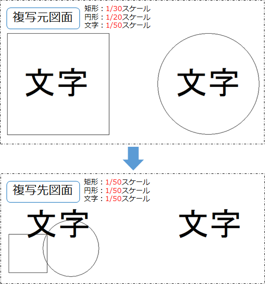 複数の作図スケールが混在する図面を別の図面ファイルに複写する場合複数の作図スケールが混在する図面を別の図面ファイルに複写する場合