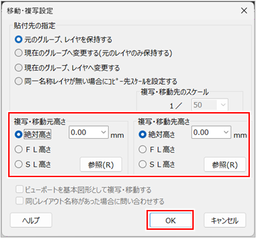 複写元・複写先図面の高さを選択し、[OK]ボタンをクリックします。