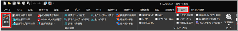 作図完了後、[表示]タブの[軸角]をクリックします。