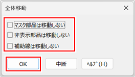 図面全体の図形を移動します。マスク部品(編集不可部品)・非表示部品や補助線も含めて移動するかを選択できます。