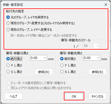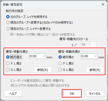 移動元・移動先図面の高さを選択し、[OK]ボタンをクリックします。
