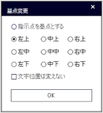 図形上の整列の基準とする位置を選択します。例えば基点が[左上]の場合は、各図形の左上の位置がそろうように整列させます。 [基点]ボタンをクリックすると、[基点変更]ダイアログで基点を設定できます。