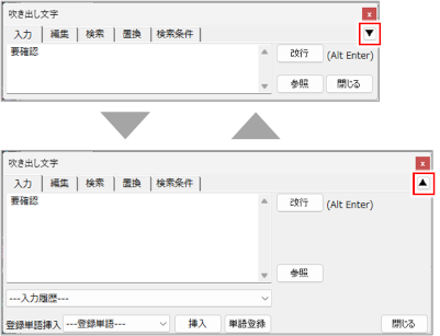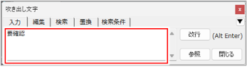 [吹き出し文字]ダイアログの[検索][置換]タブで、作図した吹き出し文字を検索できます。検索した文字を削除したり、別の文字に置き換えたりできます。 操作方法は[文字]ダイアログと同じです。操作方法について、詳しくは以下を参照してください。 |