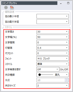 [コマンドプロパティ]で以下の設定をしている場合を例に作図方法を説明します。