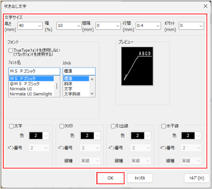 文字や矢印、引き出し線のスタイルを設定し、[OK]ボタンをクリックします。