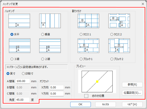 [ハッチング変更]ダイアログで、ハッチングの内容を設定します。
