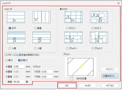 ハッチング内容を設定し、[OK]ボタンをクリックします。