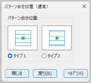 [パターン合せ位置]ダイアログで、合わせ位置のタイプを選択し、[閉じる]ボタンをクリックします。設定を変更せずにダイアログを閉じる場合は、[戻り]ボタンをクリックします。 表示されるタイプは、[ハッチング][割り付け]の選択内容に応じて変わります。