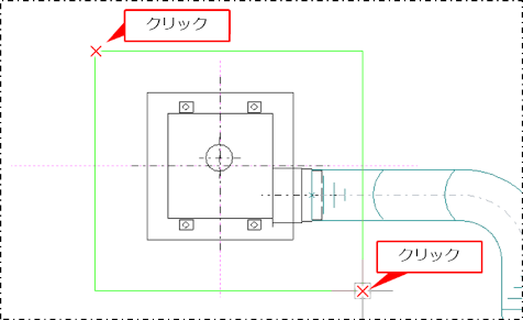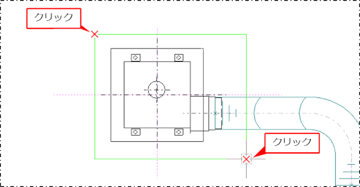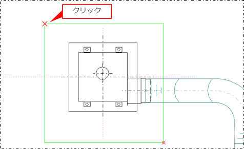 ハッチングする部品を含む領域の始点と終点をクリックします。