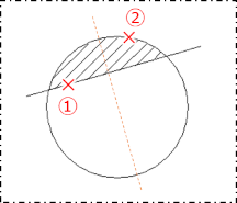 複数の図形に囲まれた閉鎖領域をハッチングする場合は、対象の領域を囲む図形をクリックし、選択を確定してください。下図のように円と交わる線分で囲まれた領域をハッチングする場合は、➀(線分)、②(円)の順にクリックします。②の位置は、線分と垂直な円の中心線を想定し、中心線を越えた側をクリックする必要があります。