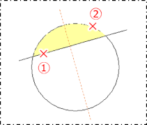 複数の図形に囲まれた閉鎖領域を塗りつぶす場合は、対象の領域を囲む図形をクリックし、選択を確定してください。下図のように円と交わる線分で囲まれた領域を塗りつぶす場合は、➀(線分)、②(円)の順にクリックします。②の位置は、線分と垂直な円の中心線を想定し、中心線を越えた側をクリックする必要があります。