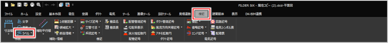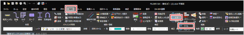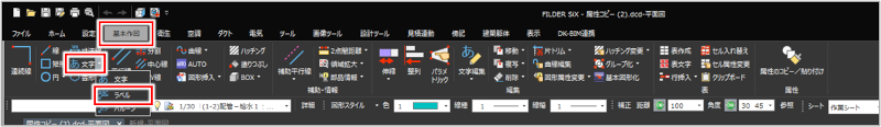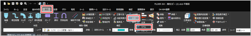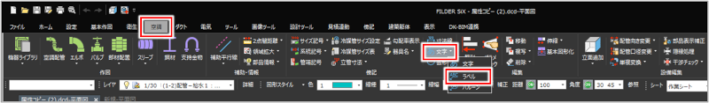 [基本作図]タブ>[文字]プルダウンメニュー>[ラベル] [衛生]タブ>[文字]プルダウンメニュー>[ラベル] [空調]タブ>[文字]プルダウンメニュー>[ラベル] [ダクト]タブ>[文字]プルダウンメニュー>[ラベル] [電気]タブ>[文字]プルダウンメニュー>[ラベル] [傍記]タブ>[ラベル] |