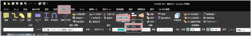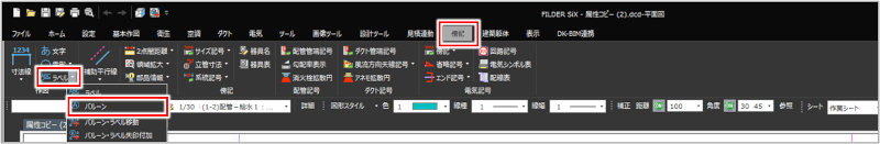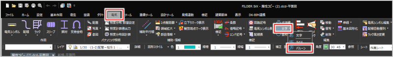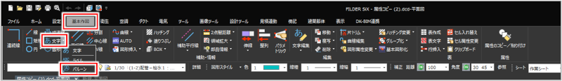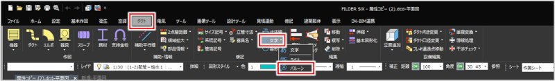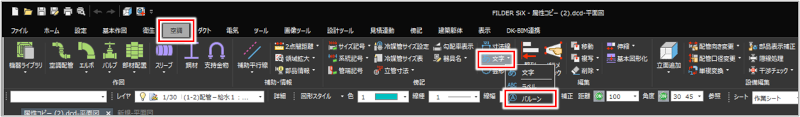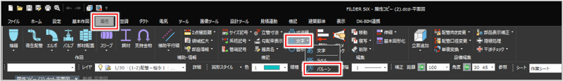 [基本作図]タブ>[文字]プルダウンメニュー>[バルーン] [衛生]タブ>[文字]プルダウンメニュー>[バルーン] [空調]タブ>[文字]プルダウンメニュー>[バルーン] [ダクト]タブ>[文字]プルダウンメニュー>[バルーン] [電気]タブ>[文字]プルダウンメニュー>[バルーン] [傍記]タブ>[ラベル]プルダウンメニュー>[バルーン] |
